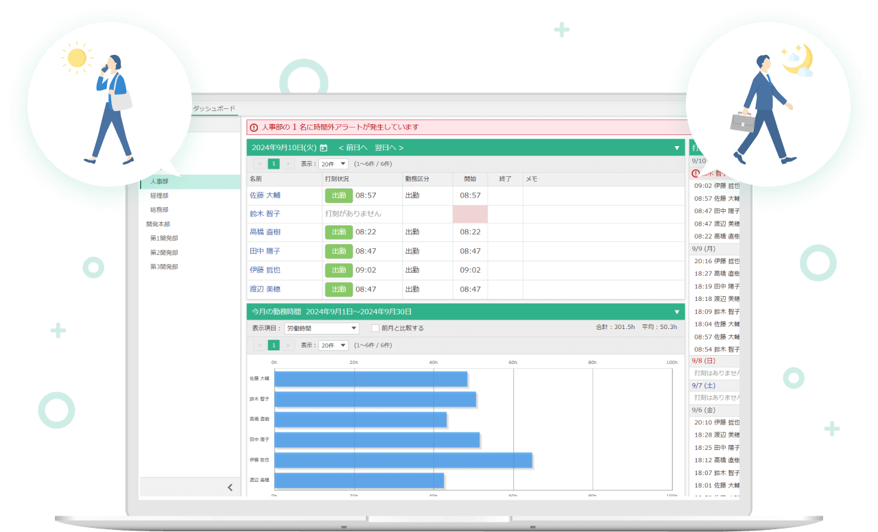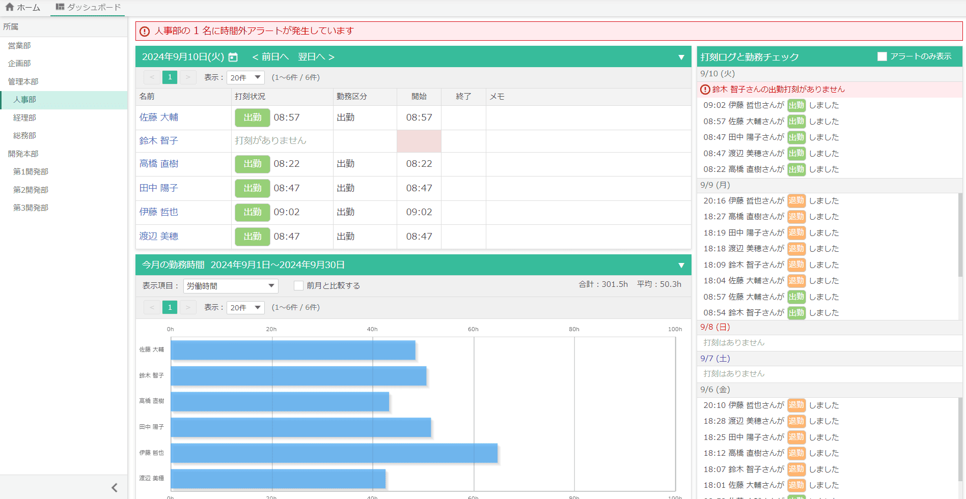 本日や昨日の出退勤状況の確認、打刻忘れ等の勤務アラート、今月の労働時間・残業時間などのグラフ表示を管理者が1つの画面で確認することができます。また、拠点ごとの表示も可能であるため、離れた拠点の状況もリアルタイムに把握することができます。