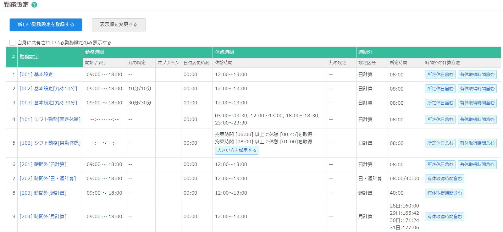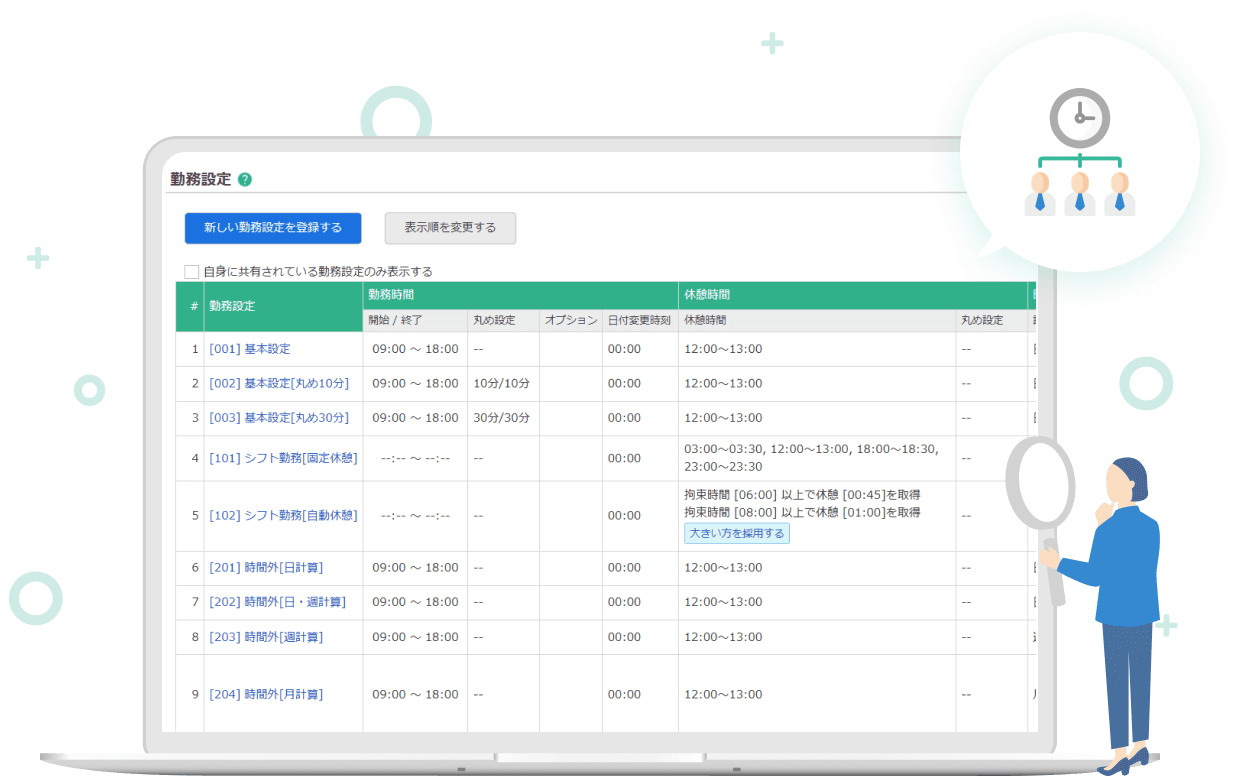 - 所定労働時間や勤務の始業/就業時刻を設定可能