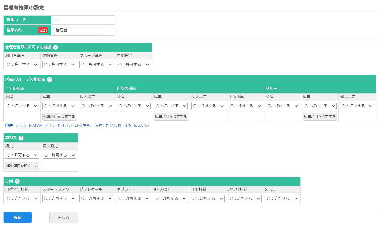 また、権限は柔軟に設定を変更することができるため、例えばタイムレコーダーなどの共用打刻は許可するが、個人のスマホやPCからの打刻は許可しない等の権限設定も可能です。