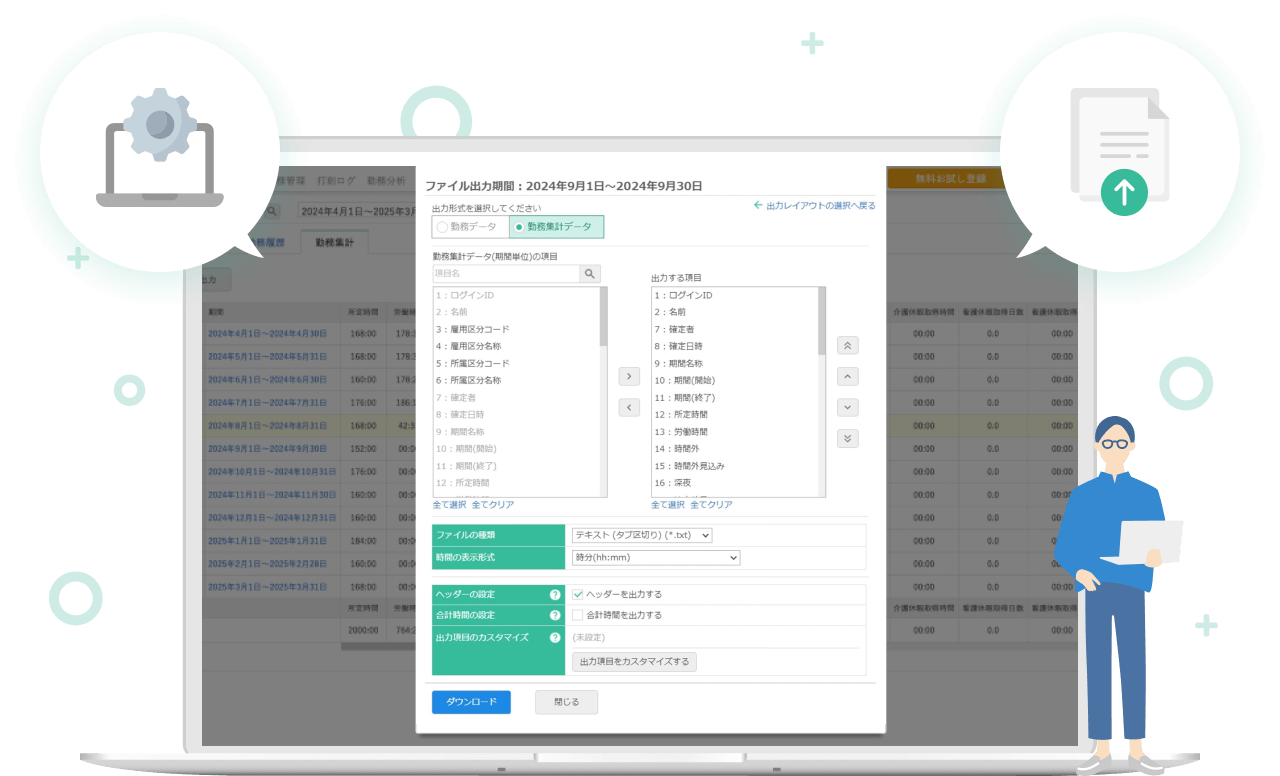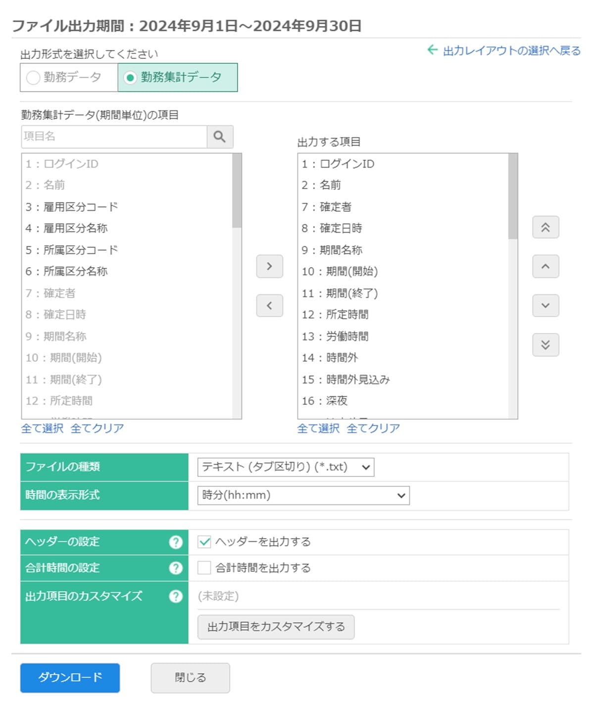 出力する項目や順番、時間の表示形式、項目名は給与計算ソフトに合わせて自由にカスタマイズする事が可能です。