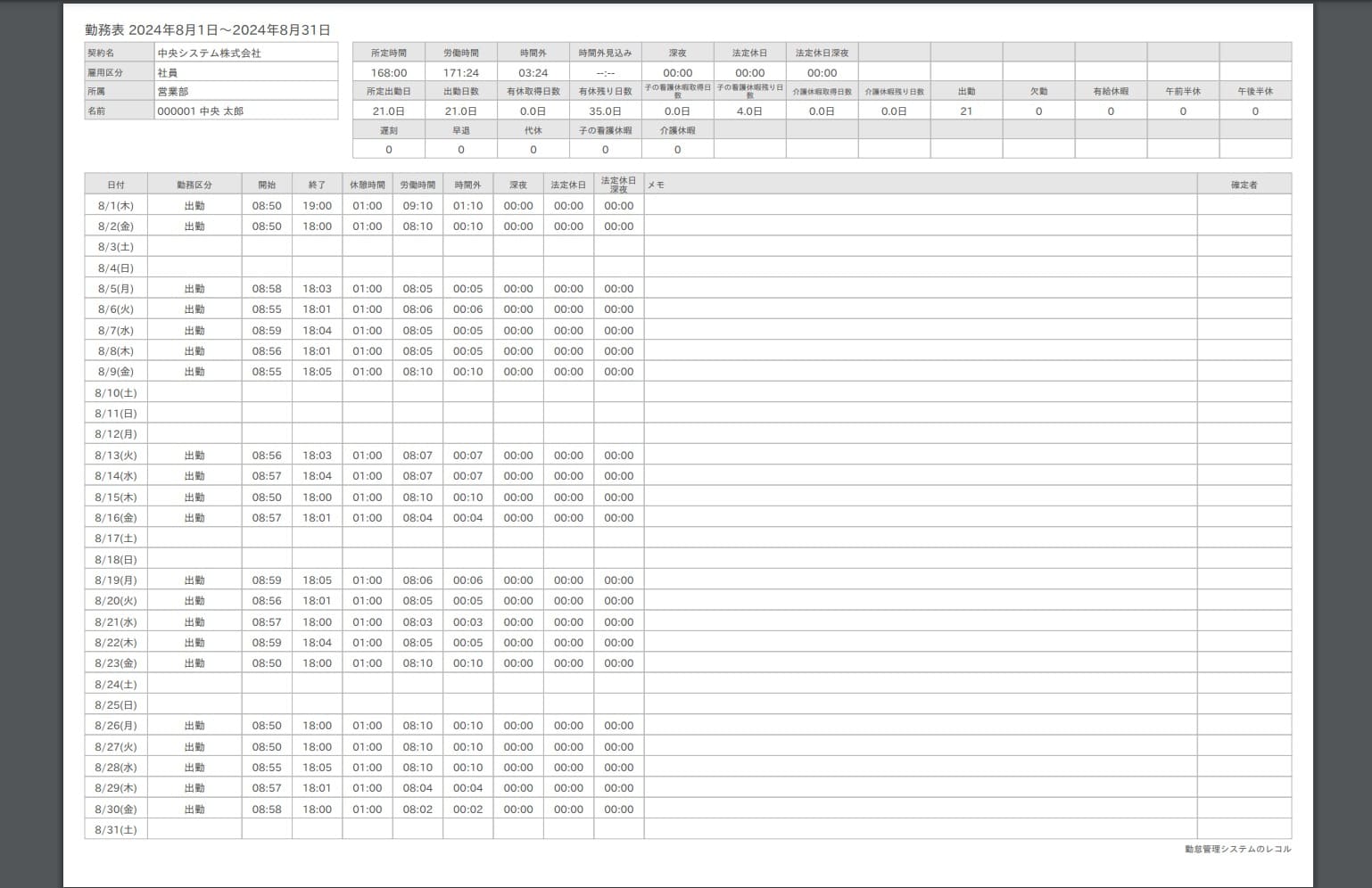 - 特定の従業員の勤務表(1か月~最大1年分)を出力