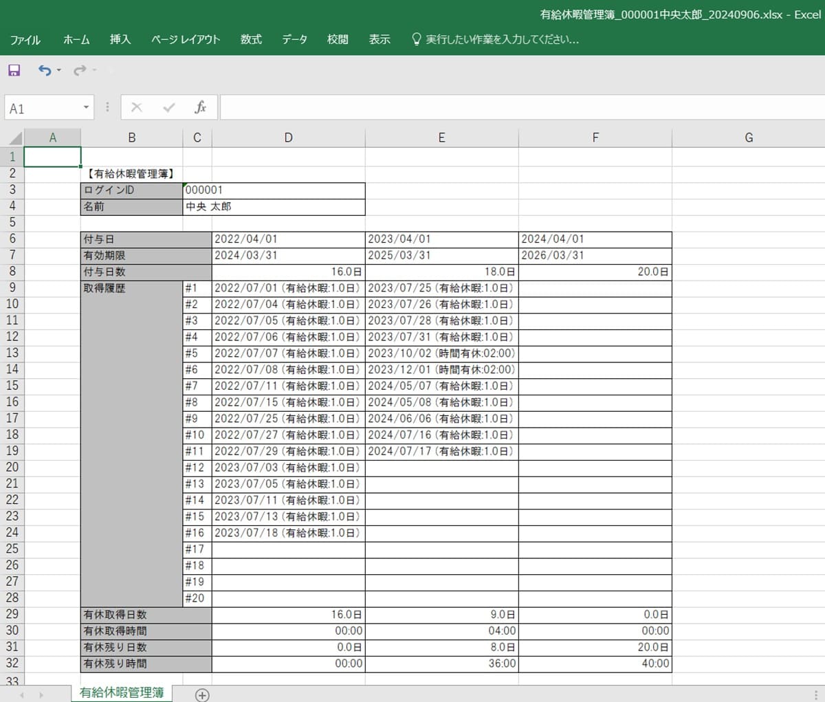 時季(有休を取得した日付)や日数(有休を取得した日数)、基準日(有休取得の権利が応じた日)などをエクセル形式の「有給休暇管理簿」として簡単に出力することが可能です。