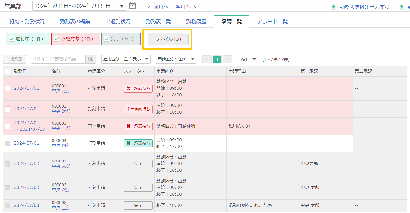 日次・月次の勤怠データをCSV形式でファイル出力してお使いの給与計算ソフトへ取り込むことができます。