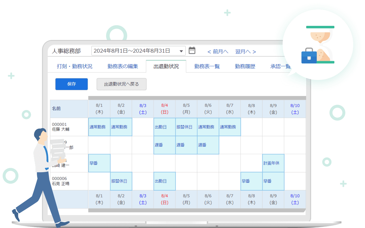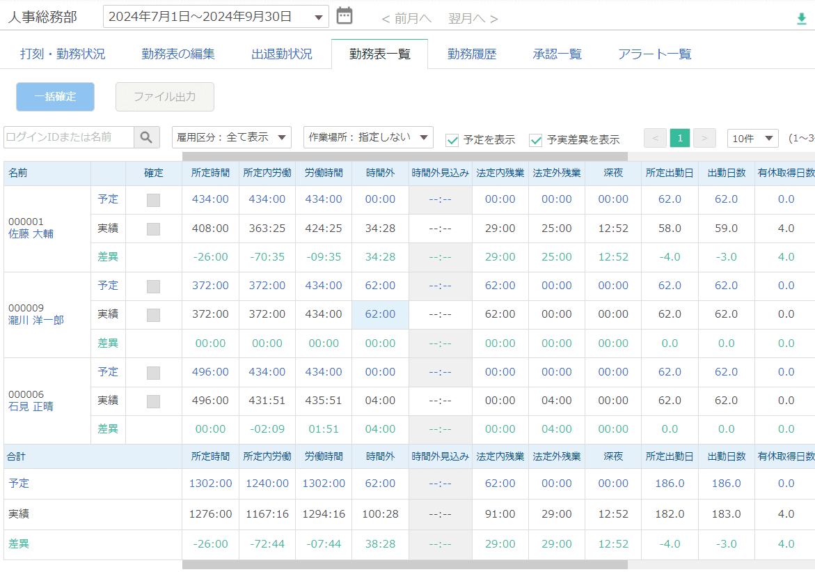従業員の勤務状況、残業時間などの予定と実績、差異をリアルタイムに把握することができます。