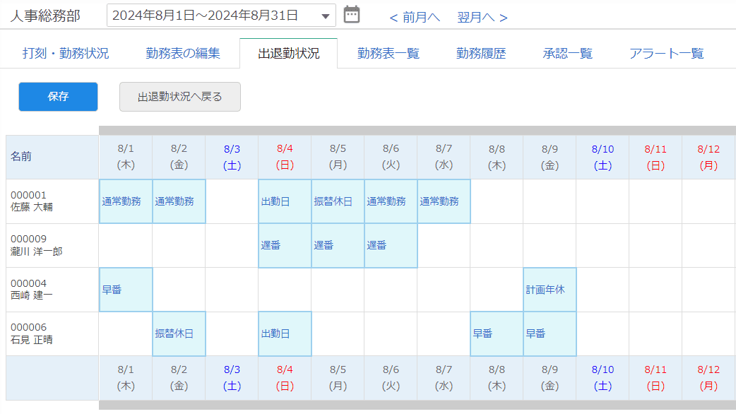 あらかじめ登録した勤務スケジュールを元に、複数人、複数日付の予定/勤務実績をまとめて編集することができます。