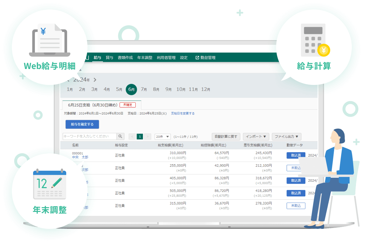 また、給与計算だけではなく給与明細や源泉徴収票のWeb発行や年末調整等、給与担当者に必要な機能が揃っています。