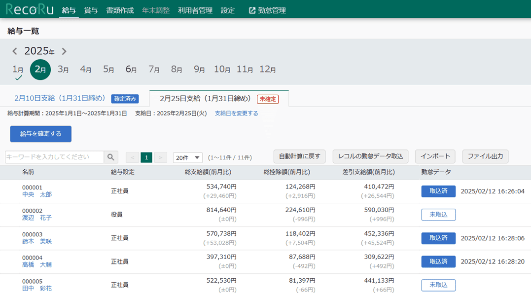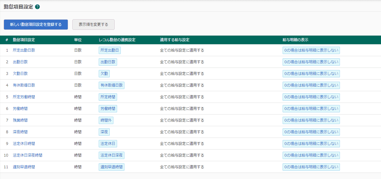 レコルの勤怠データをそのまま給与計算に使うことができるため、従業員情報の連携や勤怠データのCSV・APIによる連携が不要です。勤怠管理で集計した時間、日数、回数などすべて連携が可能です。