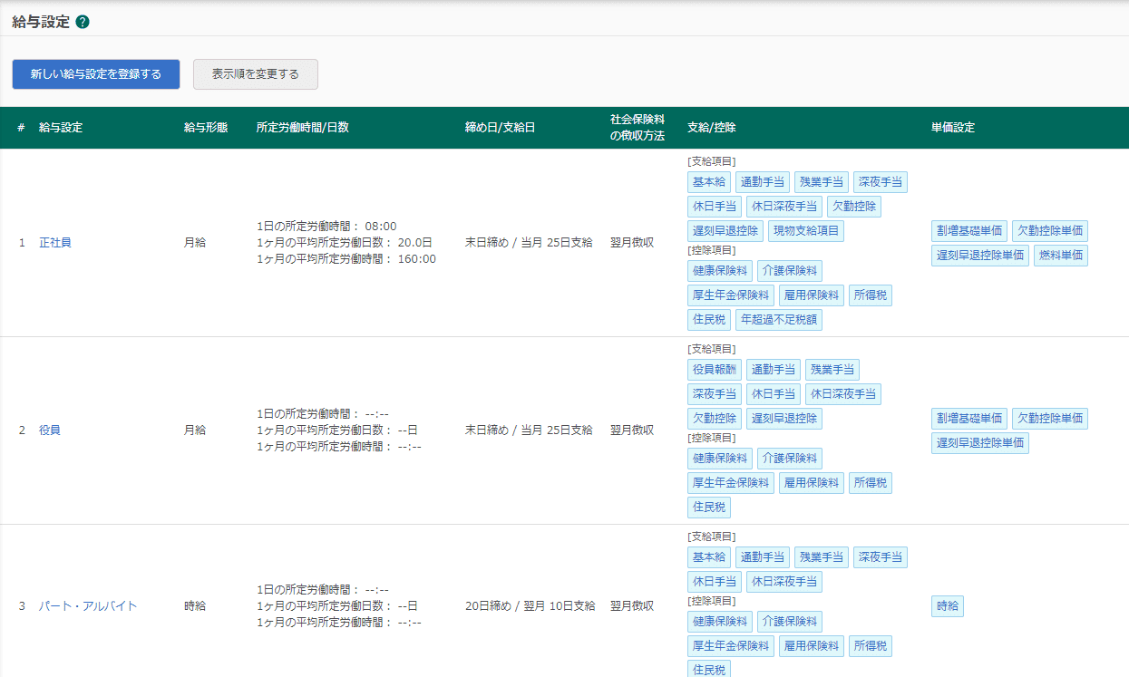 給与計算をパターンごとに複数作成することができます。正社員(月給)、派遣社員(日給)、パート・アルバイト(時給)等、必要に合わせて自由に給与規定をグループ化して作成することができます。