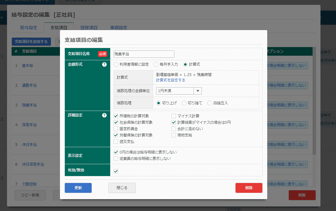 四則演算や端数処理を利用して柔軟に計算式も設定できますので、残業代や各種手当など会社の給与規定に合わせた設定が可能です。
