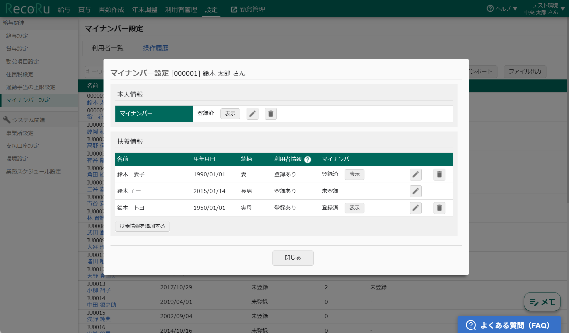 「通勤手当」「所得税」「社会保険料」「雇用保険料」などの計算を利用者情報の年齢や入社日、退職日、扶養情報の設定に基づいてシステムが自動で計算します。