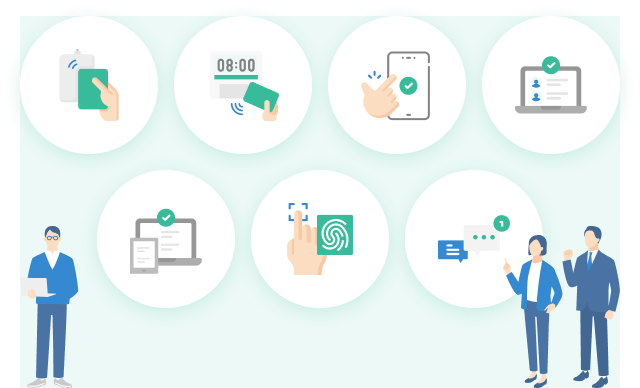高精度・高セキュリティな本人認証を実現し、なりすましによる不正打刻対策に最適です。有線LAN、無線LANのどちらにも対応したPC不要の専用タイムレコーダーのため、設置場所を選ばず省スペースで利用できます。ICカードによる打刻も可能で、お手持ちの社員証や交通系ICカードをご利用できます。