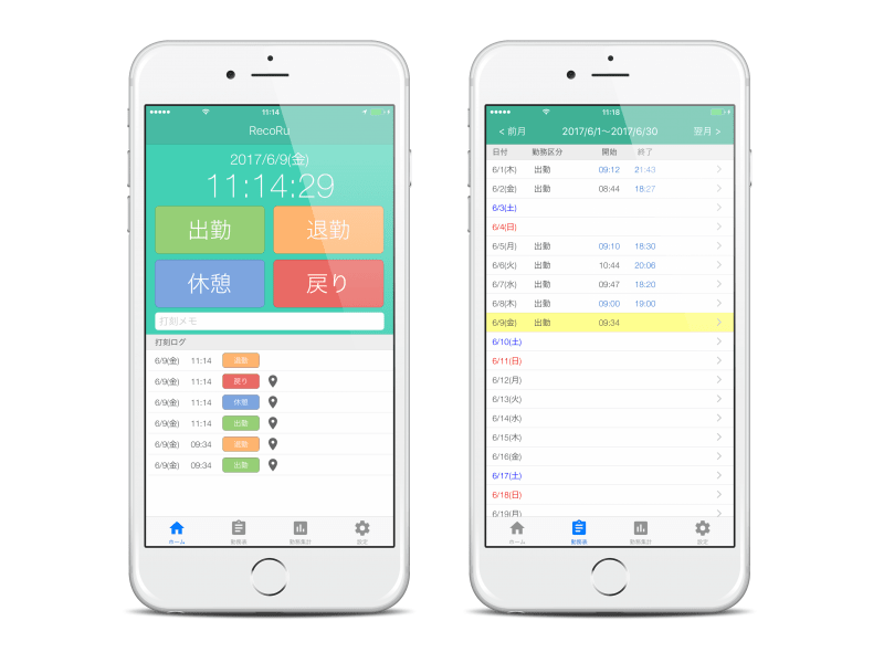 - 出勤、退勤など打刻モードはボタンで簡単に切り替え