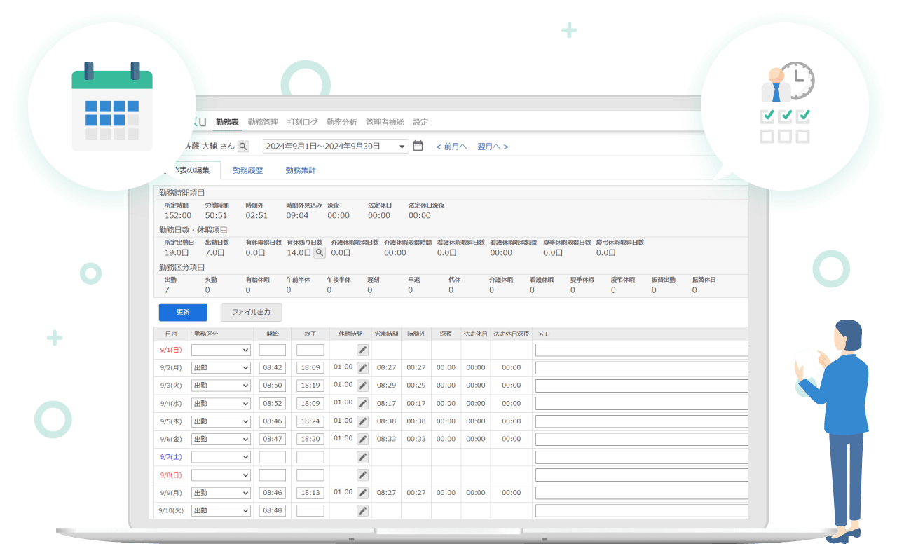 従業員と勤怠管理者に必要な情報を簡単な操作で確認することができます。