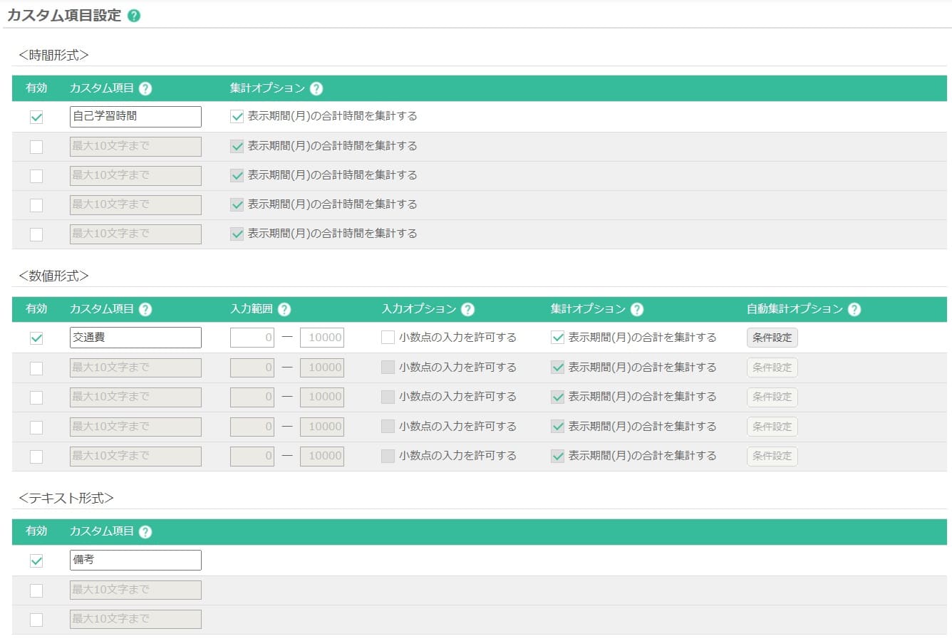 時刻/数値/テキストの形式で任意の項目を追加することができます。