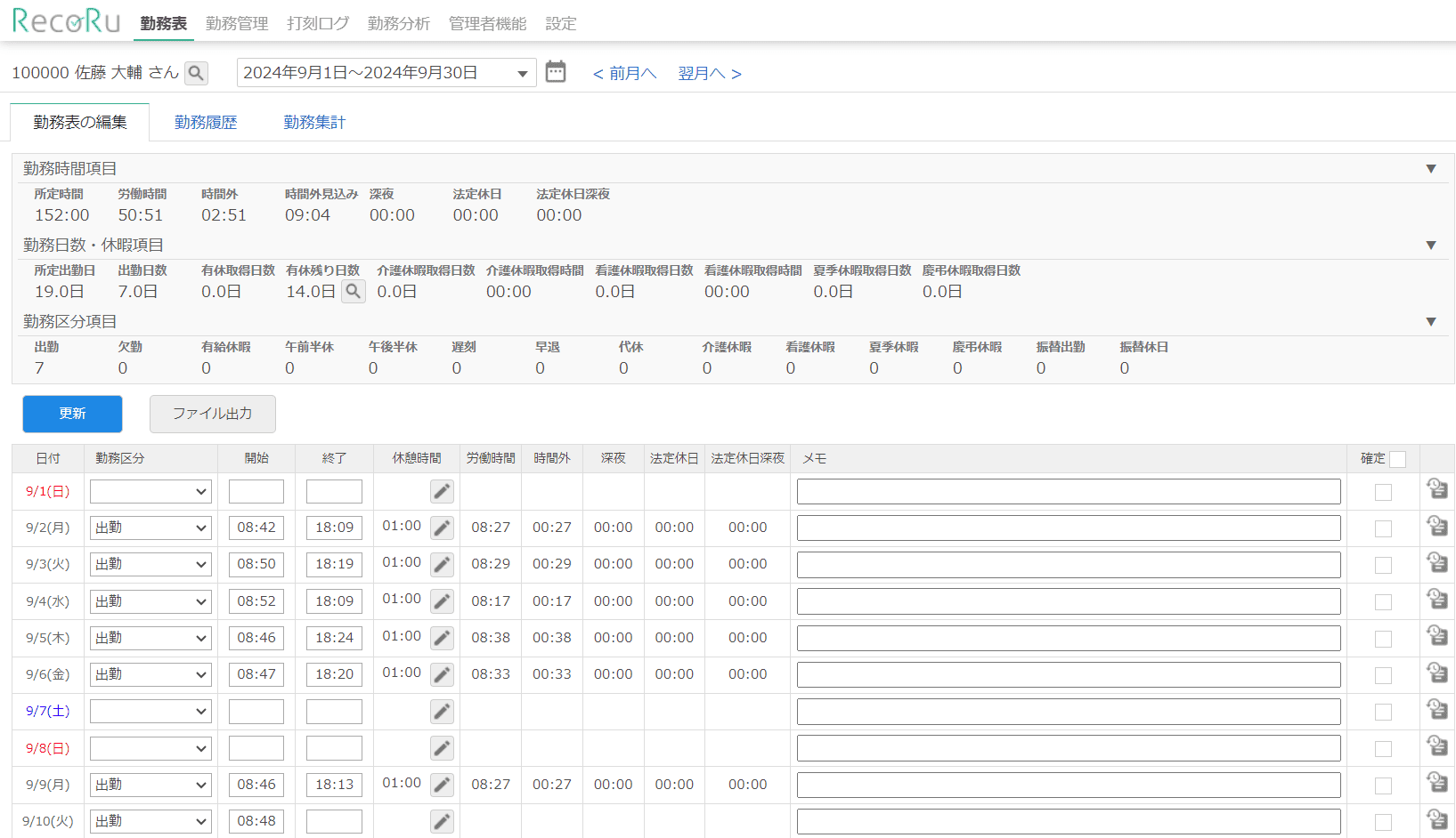 レコルの勤務表は日々の労働時間や残業時間、有休残り日数、勤務修正履歴、打刻忘れのアラート等、