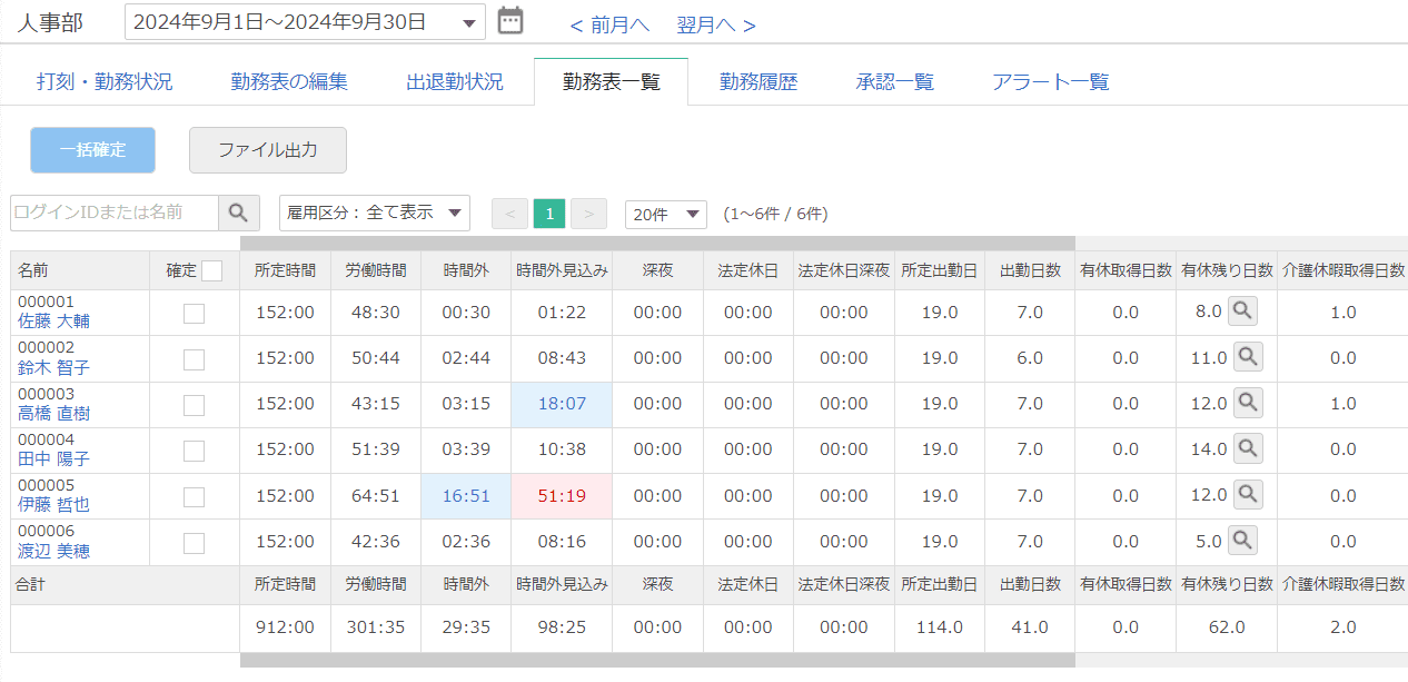 月次の労働時間や残業時間についても自動で集計されますので、給与計算に必要な勤務集計も容易にできるようになります。