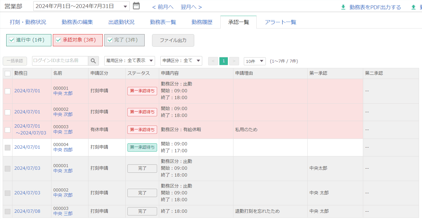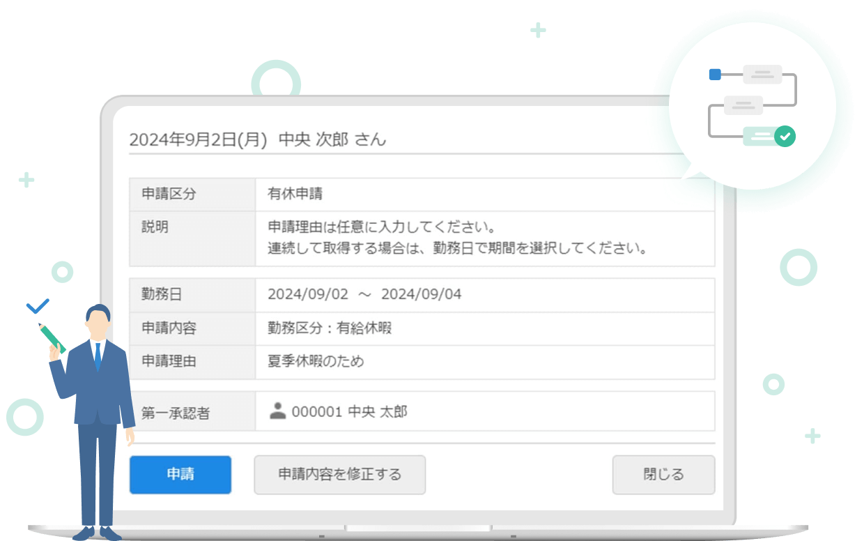管理者は承認一覧から申請内容を確認して、申請の承認/差し戻しを行うことができます。承認/差し戻しをすると、申請者や承認者に画面やメールで通知されます。