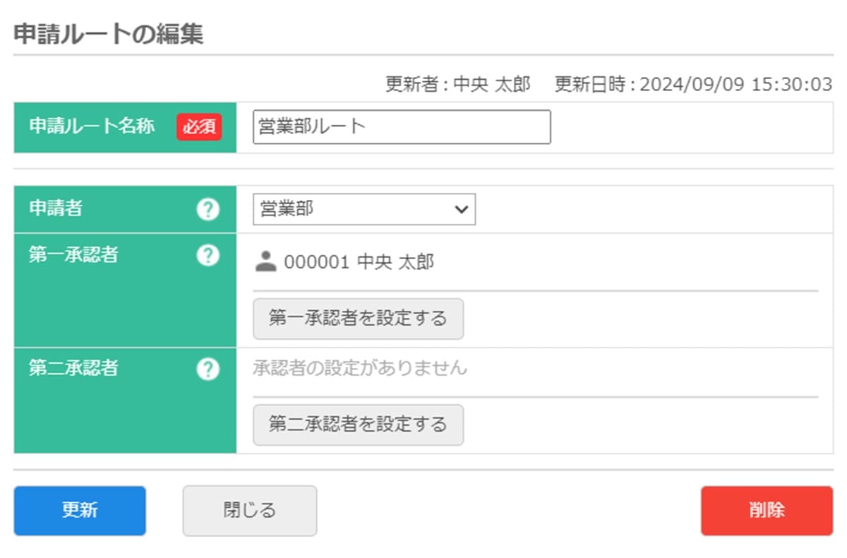 承認者の選択・順番を申請ルートとして設定可能です。承認は2段階まで設定可能ですので、管理者→総務のような承認ルートも作成可能です。