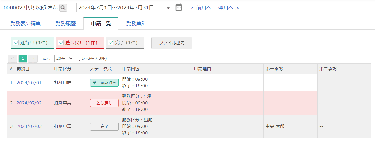従業員は自分の申請の状況を確認できます。また、申請を自分で差し戻すことも可能です。