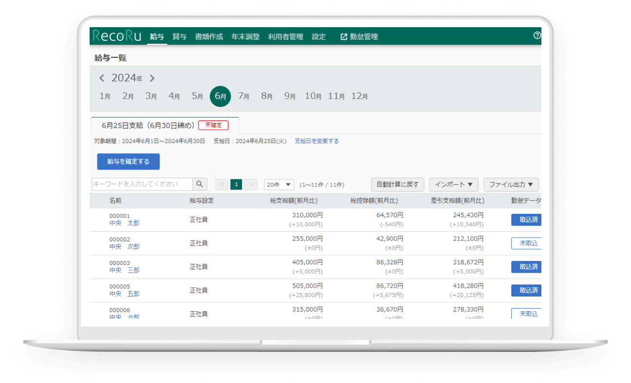 レコルは勤怠管理と給与計算が1つのシステムですので、